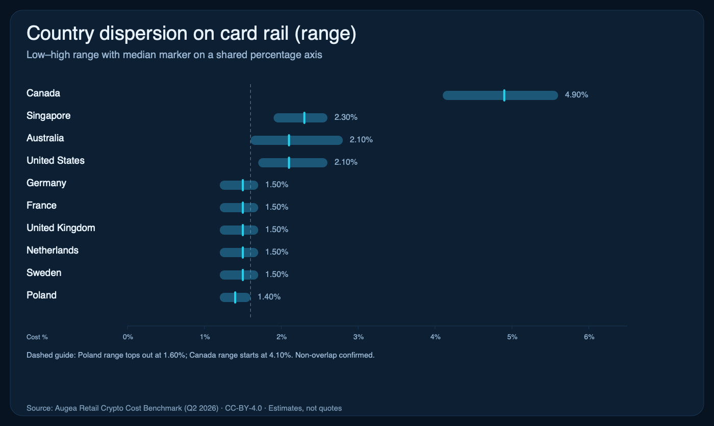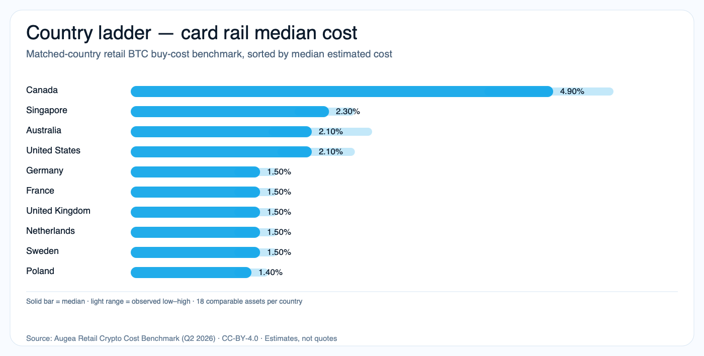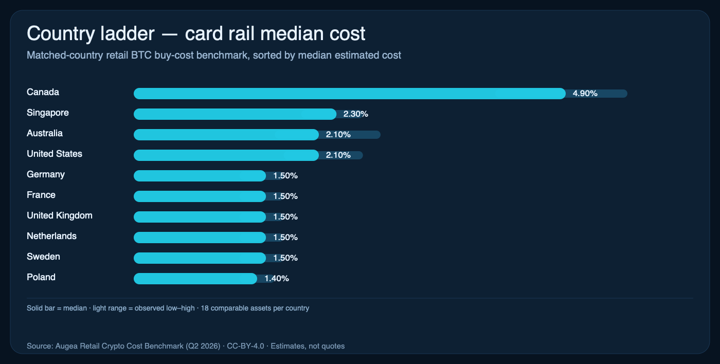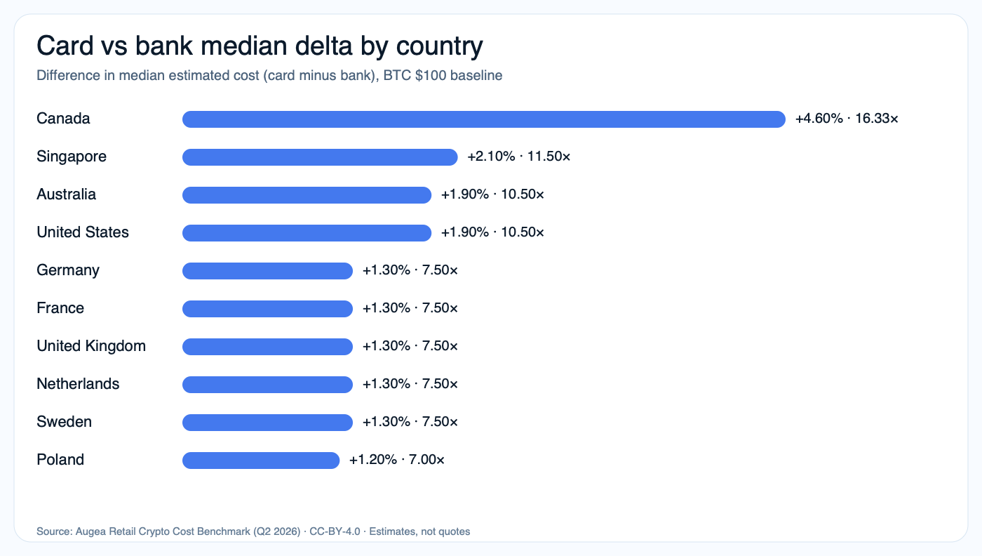 A $100 retail BTC buy costs about 3.50× more in Canada than Poland on matched card routes. Every number here is reproducible from public country-level snapshots.