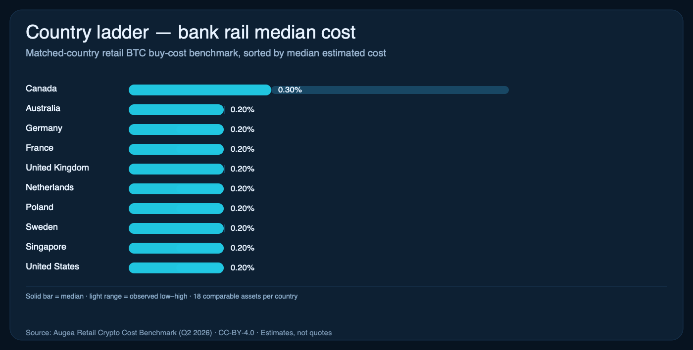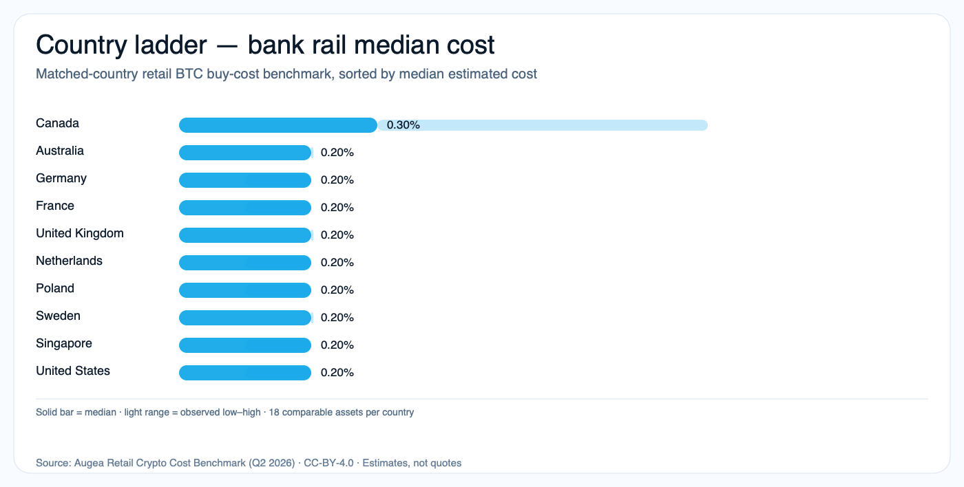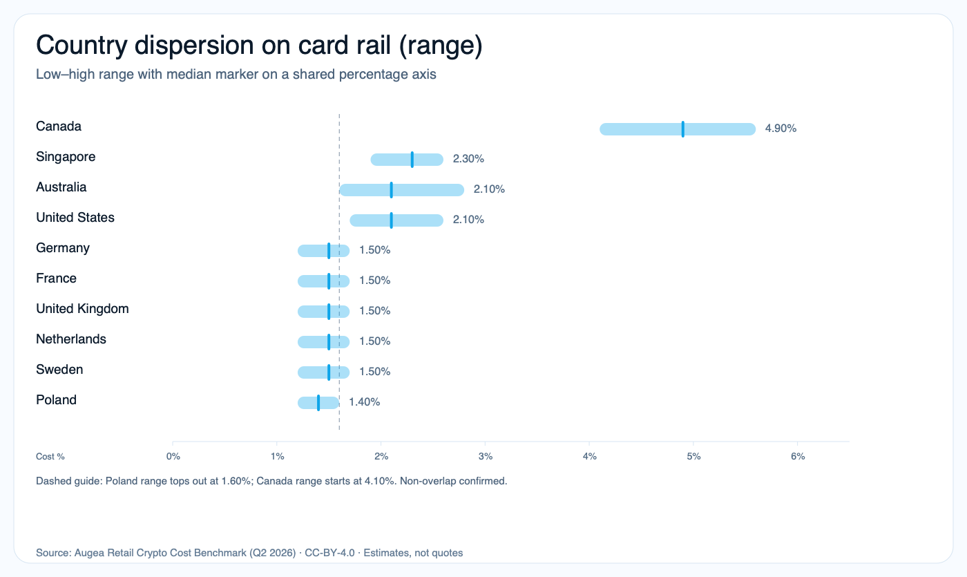 A $100 retail BTC buy costs about 3.50× more in Canada than Poland on matched card routes. Every number here is reproducible from public country-level snapshots.
